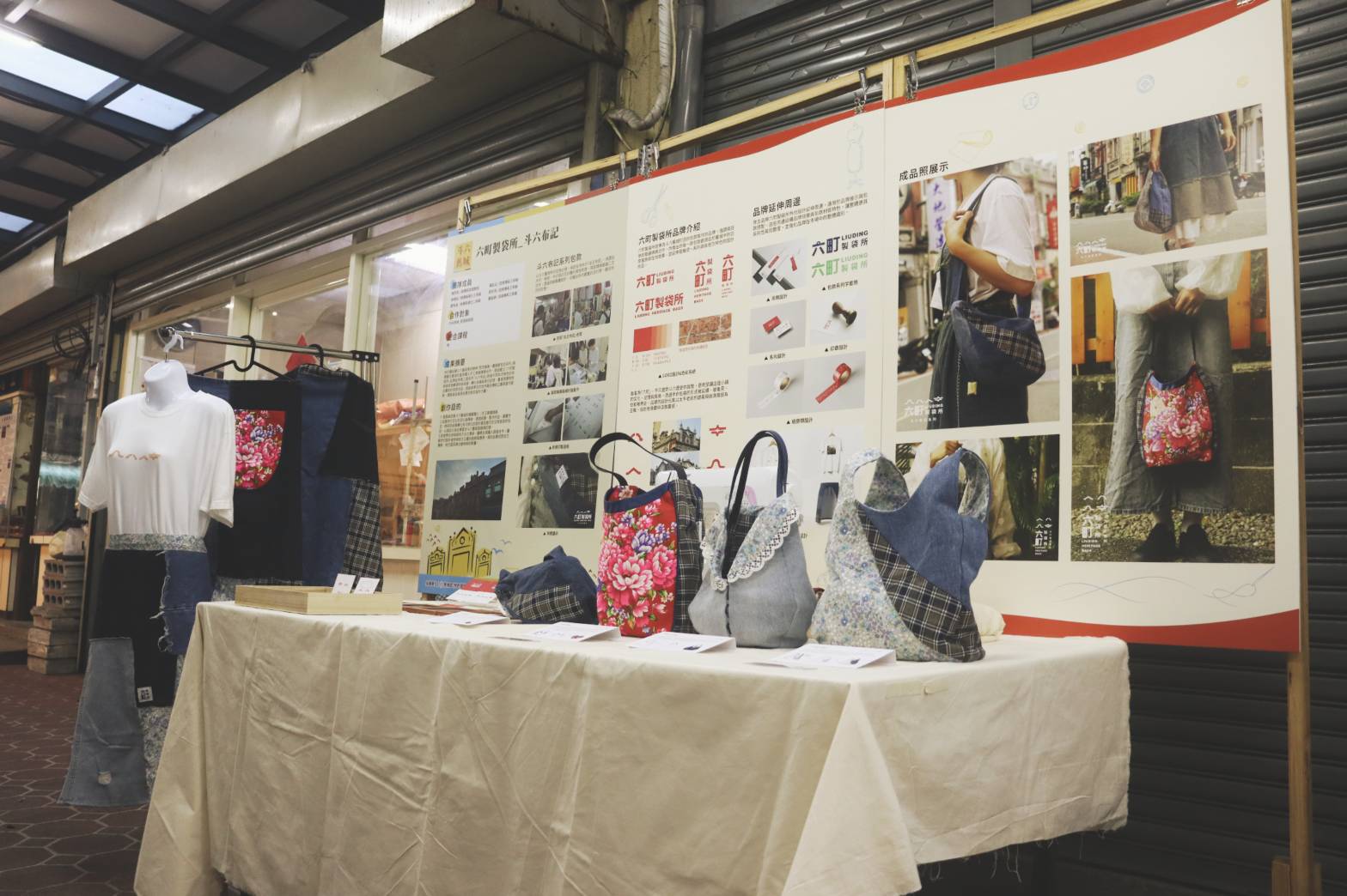 展場左側(圖3-圖6)規劃為六町的品牌延伸區,呈現本次計畫所建立的品牌視覺系統,包含輔助圖形應用、工作服、系列包袋的吊牌設計等內容,也加入蓋章體驗與布料觸摸區,讓觀者能以身體去感知品牌精神,透過親手蓋印、觸摸布料的互動過程,感受不同布料的質地差異,理解包款背後的製作細節,這些互動元素不僅讓展覽更具參與感,也讓品牌的理念以更直覺的方式被觀眾感知。