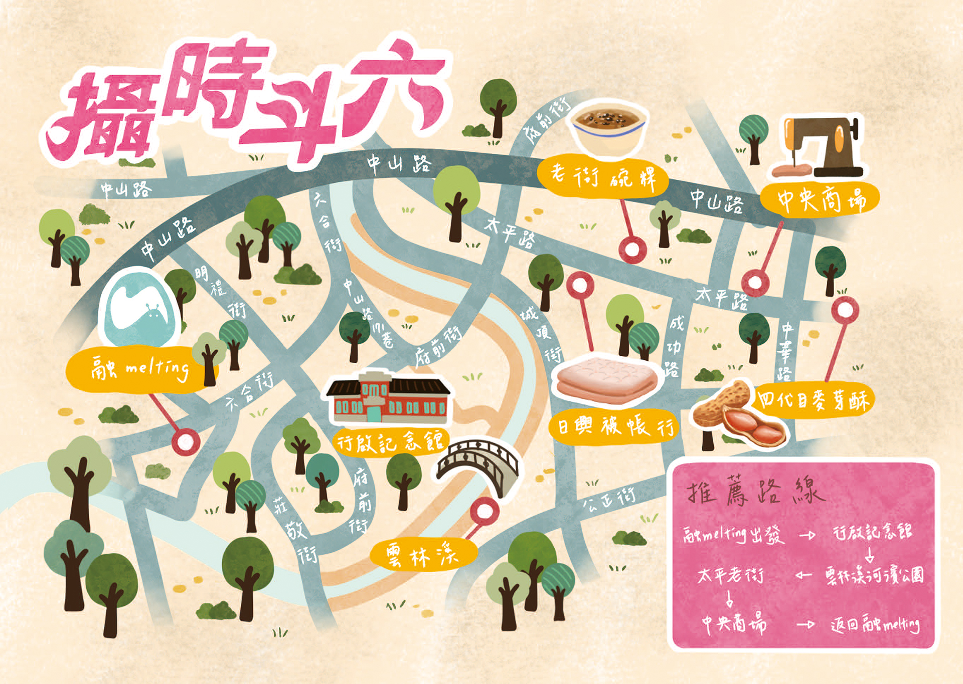 融Melting咖啡廳、行啟記念館、太平老街店家(老街碗粿、日興棉被行、四代目麥芽酥)、中央商場店家(中央美苑)